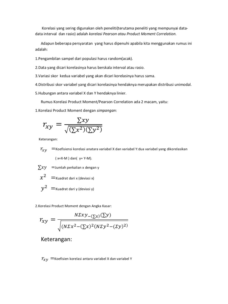 Xy 2 2 untuk menghitung mean dari variabel x n x mx untuk menghitung mean dari variabel y n y my. Pendahuluan analisis korelasi digunakan untuk menjelaskan kekuatan dan arah hubungan antara dua variabel. Korelasi pearson product moment atau biasa disebut dengan korelasi sederhana merupakan teknik korelasi yang digunakan untuk mengukur kekuatan dan arah hubungan 2 variabel yang linear. Tahapan yang harus dilalui untuk menyelesaikan rumus korelasi product moment dengan simpangan adalah: Kita akan lihat hubungan antara jam kerja dengan jumlah produksi pada sebuah pabrik.