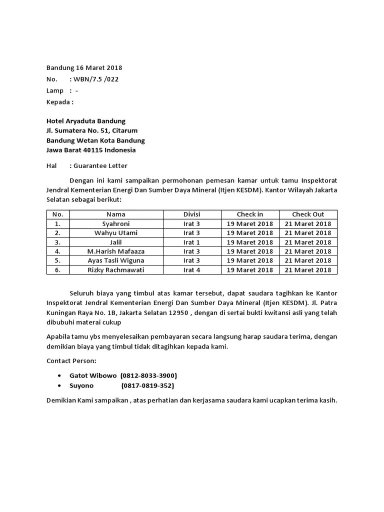 Contoh Guarantee Letter Pembayaran Hotel - Contoh Surat Jaminan Pembayaran Hotel Oleh Perusahaan Pdf : Contoh surat jaminan pembayaran hotel oleh perusahaan.. Download & view contoh surat guarantee hotel as pdf for free. Contoh surat jaminan pembayaran hotel oleh perusahaan yang benar dan resmi sebagai referensi surat jaminan yang baik dan profesional. Citra abadi jalan merpati putih km. Garansi perusahaan (corporate guarantee) sebagaimana lampiran i;. Pt segar alam abadi ruko edelwis permai blok ab3 no.