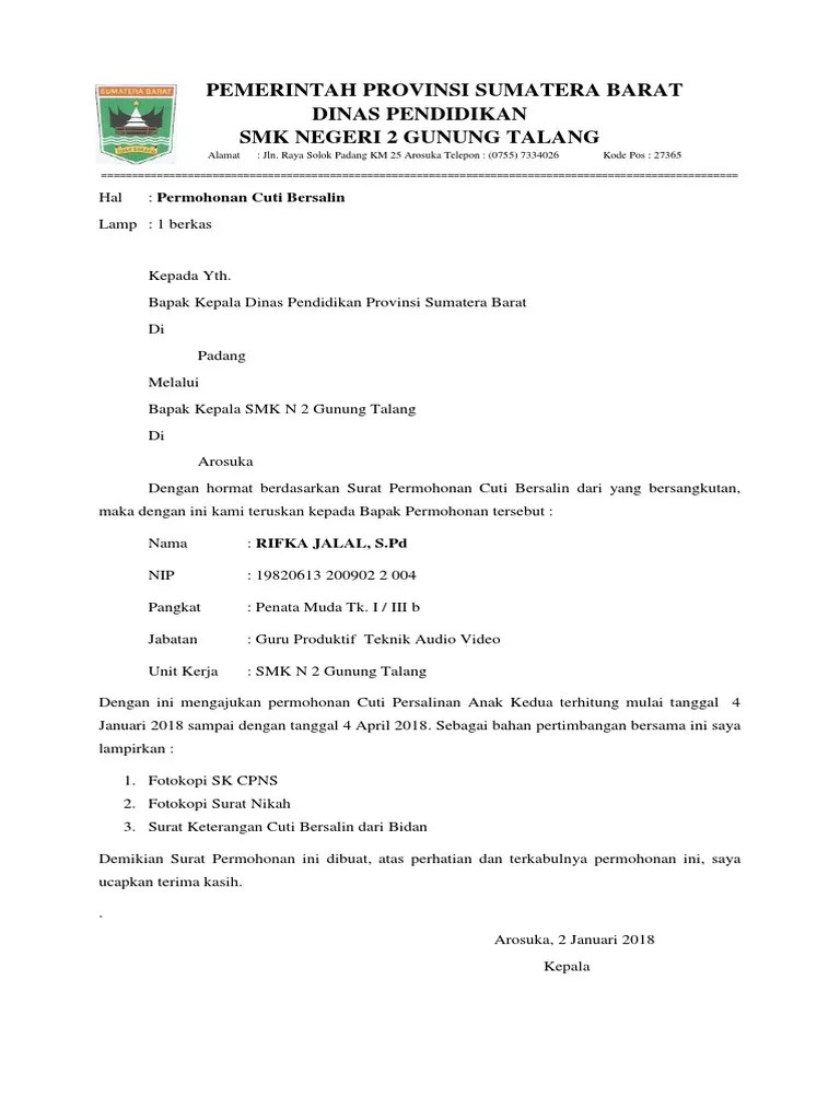 Hasanudin selaku kepala sekolah di sdn 02 merauke sehubung dengan . Cuti melahirakan merupakan hak bagi pegawai negeri sipil dan calon pegawai negeri sipil yang diperuntukkan untuk kelahiran anak pertama, kedua dan ketiga. Cuti karena alasan penting dengan melampirkan surat keterangan rawat. Surat keterangan bersalin dari dokter pemerintah. Surat permohonan cuti melahirkan kepada yang terhormat bpk.